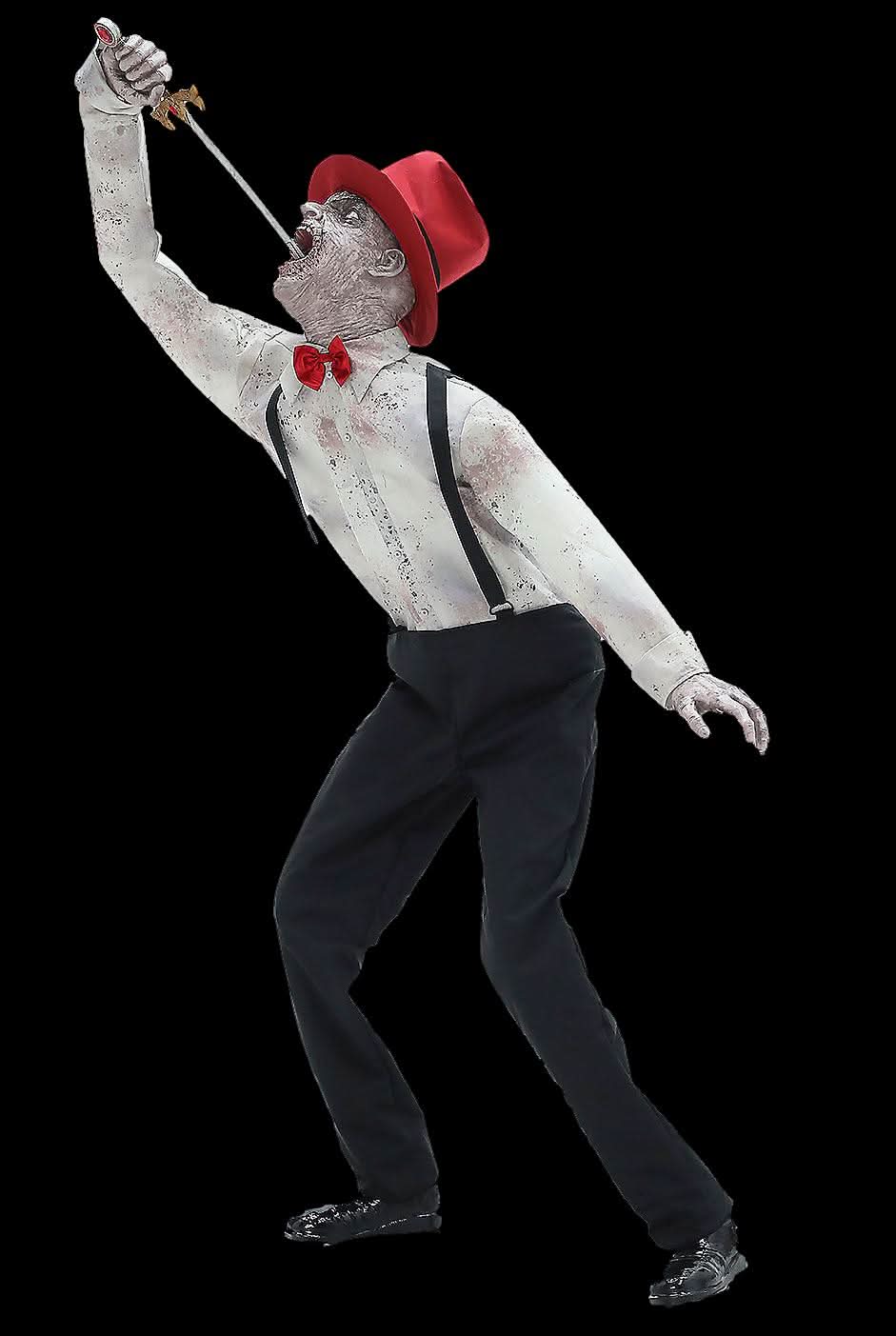 Dressed in spattered, smudged clothing and a faded red bow tie, he looks every bit the aged, deceased showman, doomed to swallow his cursed blade for eternity. As he performs, spooky circus calliope music plays faintly in the background, drawing guests closer with an unsettling mix of nostalgia and dread.