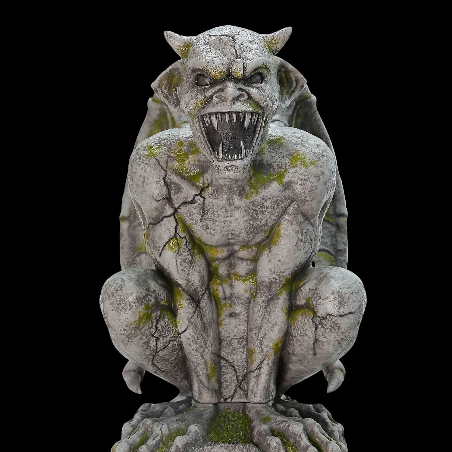 Perched atop a granite-look stone pillar, the grotesque gargoyle crouches with jagged claws and sinister detail, glaring down with unholy fury. Once activated, his piercing red LED eyes ignite like embers, while his jagged, fanged mouth glows as though lit by the fires of the underworld.