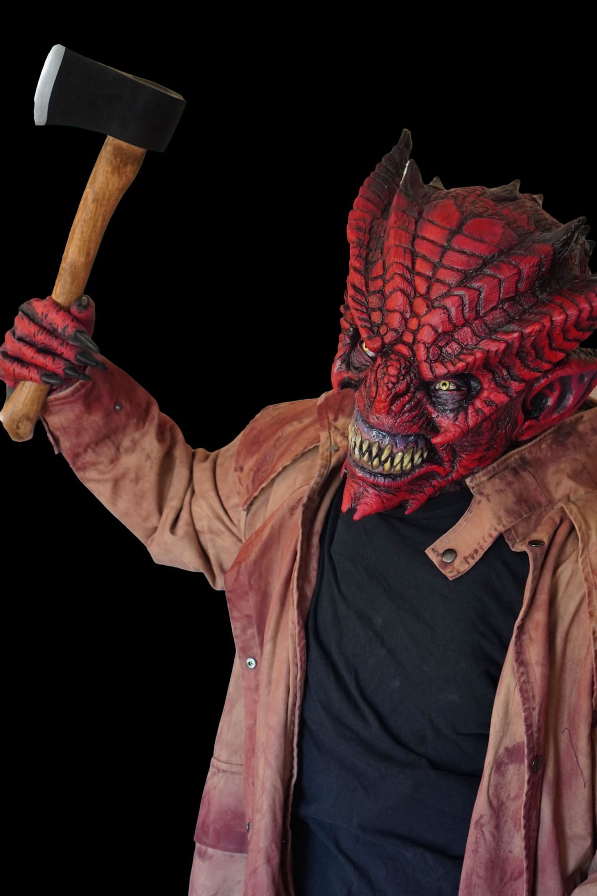 This demon comes with everything you see minus the ax. Bedlam the Demon mask, a professional distressed robe that is movie-quality with high-quality fabric, and latex stretch gloves.