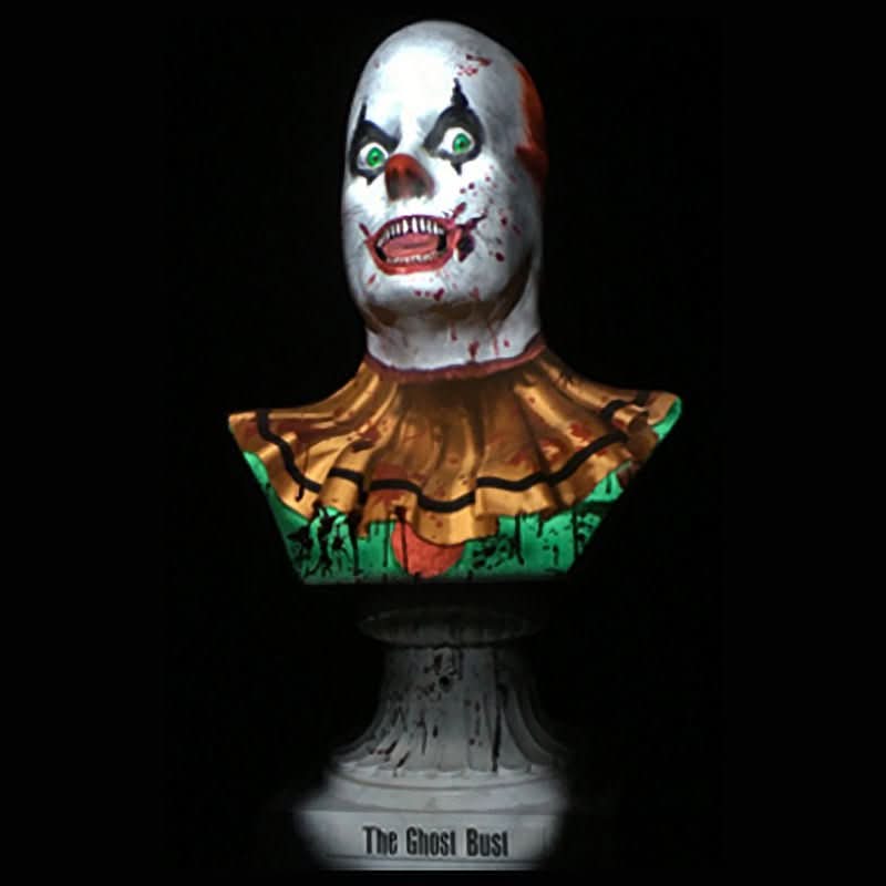 The Clown Ghost Bust projection effect from The Horror Dome is an incredibly haunting and realistic prop. This setup features a life size durable resin bust, projector and remote,. When activated, the bust comes alive and plays a scary Ghost Clown routine. It's a great way to add some big-budget looks to your haunted house attraction. Keep guests entertained as they wait their turn to enter with this brilliant prop.