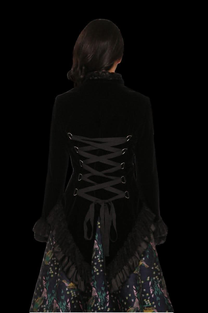 Our stunning jacket is made from a luxuriously soft velvet in rich black fabric and features a scoped v neck collar with lace trim. Military style metal button detail on the front and sleeves. Bell sleeves with lace and ruffle trim.  The back of coat has a criss-cross lace up style with long coat tails and lace ruffle trim.  Available in Black Velvet.