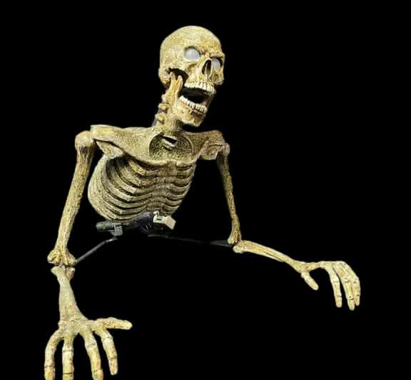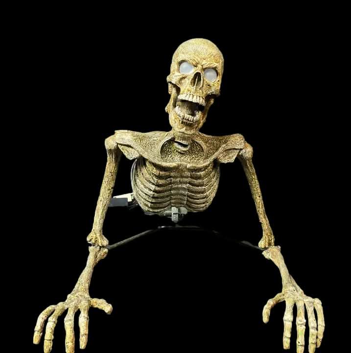 The creeper is a prop designed to appear to be creeping his way out of a freshly exhumed grave and features a highly detailed 3/4 torso skeletal body form with lifting evil skull and pivots on his elbows allowing the prop to have a natural appearance of lunging towards its victim. This version comes standard in our skeletal finish, but is available in “bloody”, “Swampy”, or “grunge” finish for an additional charge. When activated the prop lifts its head up and lunges towards your viewers. Optional spitter and LED backlit eyes are available as an add-on (will require a controller upgrade, hence the price jump).