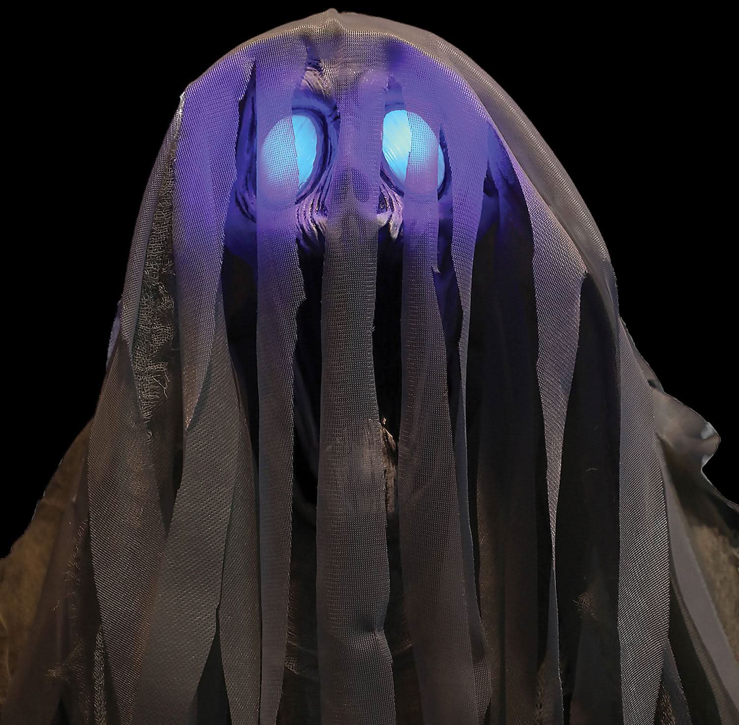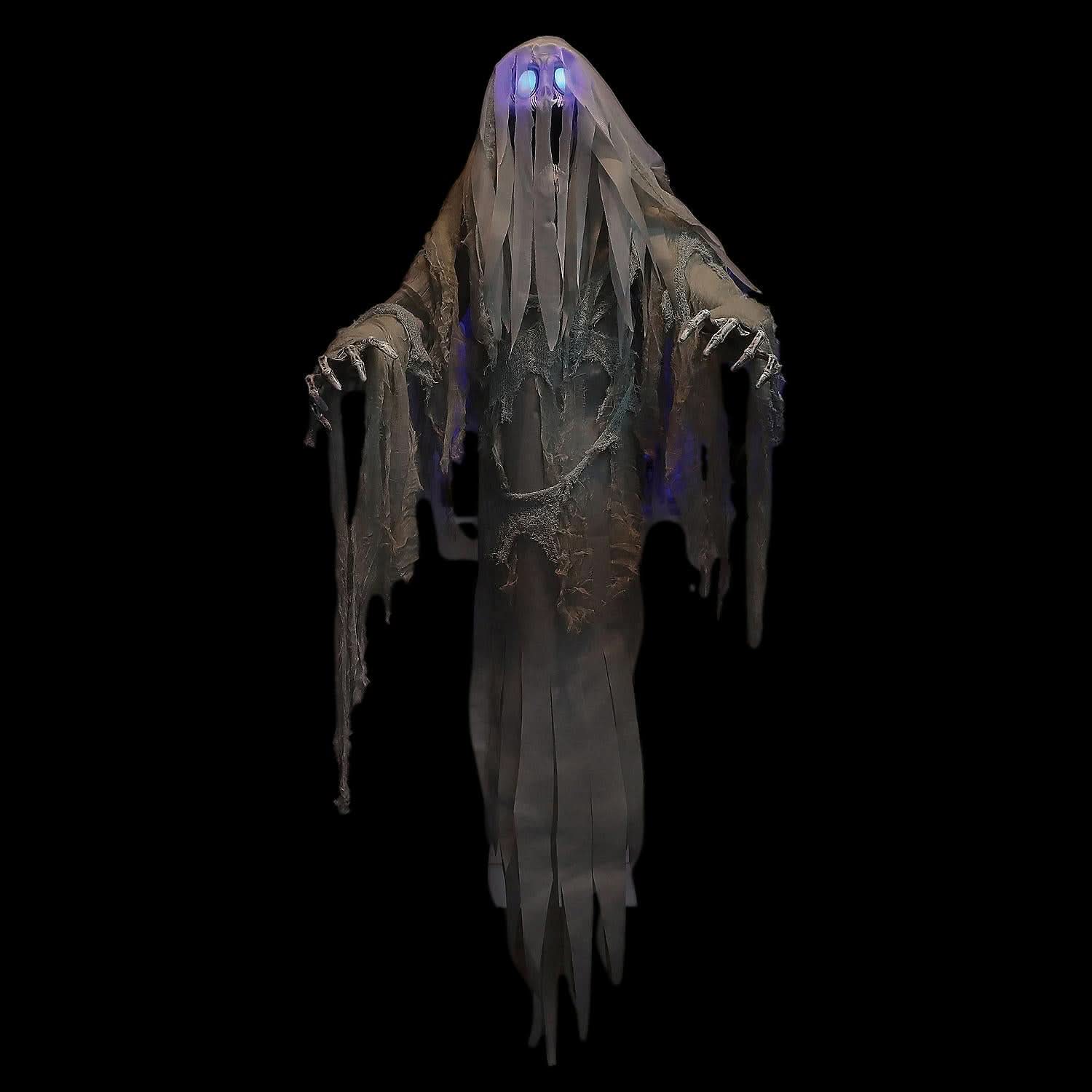 Spine-tingling 60" Ghost prop will create an otherworldly vibe in your next haunted setting! Glowing blue LED eyes peer out from the greyish gauzy ghostly coverings, and the posable arms with the long creepy fingers reach out to you from beyond the grave! Terrifying organ music plays and the prop hangs from anywhere, adding just the right spooky touch for your Halloween party! Requires 3 AA batteries, not included.